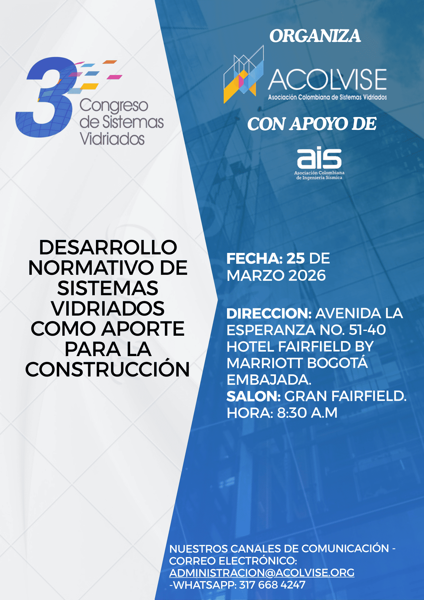 El Tercer Congreso de Sistemas Vidriados se llevará a cabo el próximo 25 de marzo de 2026 en el Hotel Fairfield by Marriott Bogotá Embajada, Salón Gran Fairfield, ubicado en la Avenida La Esperanza No. 51-40. El registro iniciará a las 7:45 a. m. Con el apoyo de la AIS.
